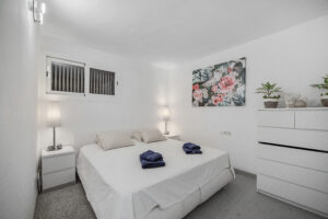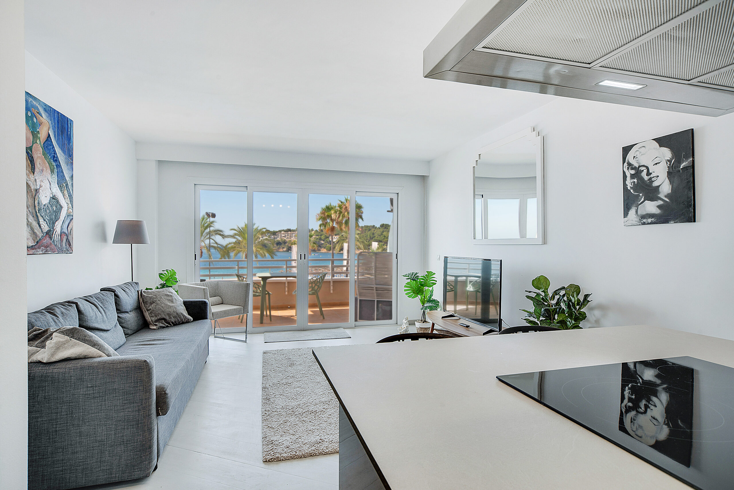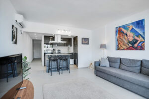 Die kleinere Wohnung bietet ein Schlafzimmer, ein modernes Bad, eine offene Küche mit Essbereich und einen hellen Wohnraum mit direktem Zugang zum Balkon – ebenfalls mit unverbautem Meerblick in erster Linie.